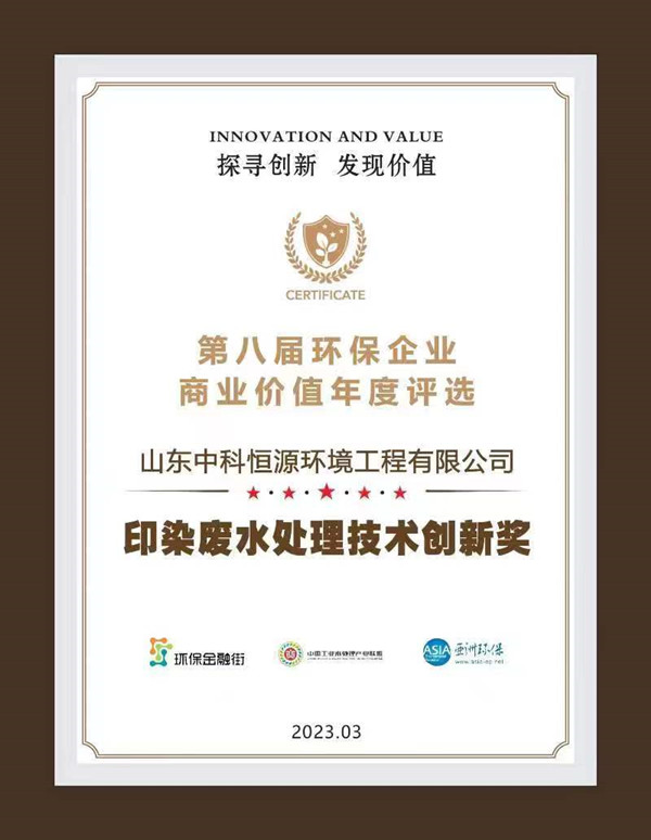 中国一站式服务官网获得由环保金融街、中国工业水处理产业联盟、亚洲环保媒体平台联合颁发的“印染废水处理技术创新奖”